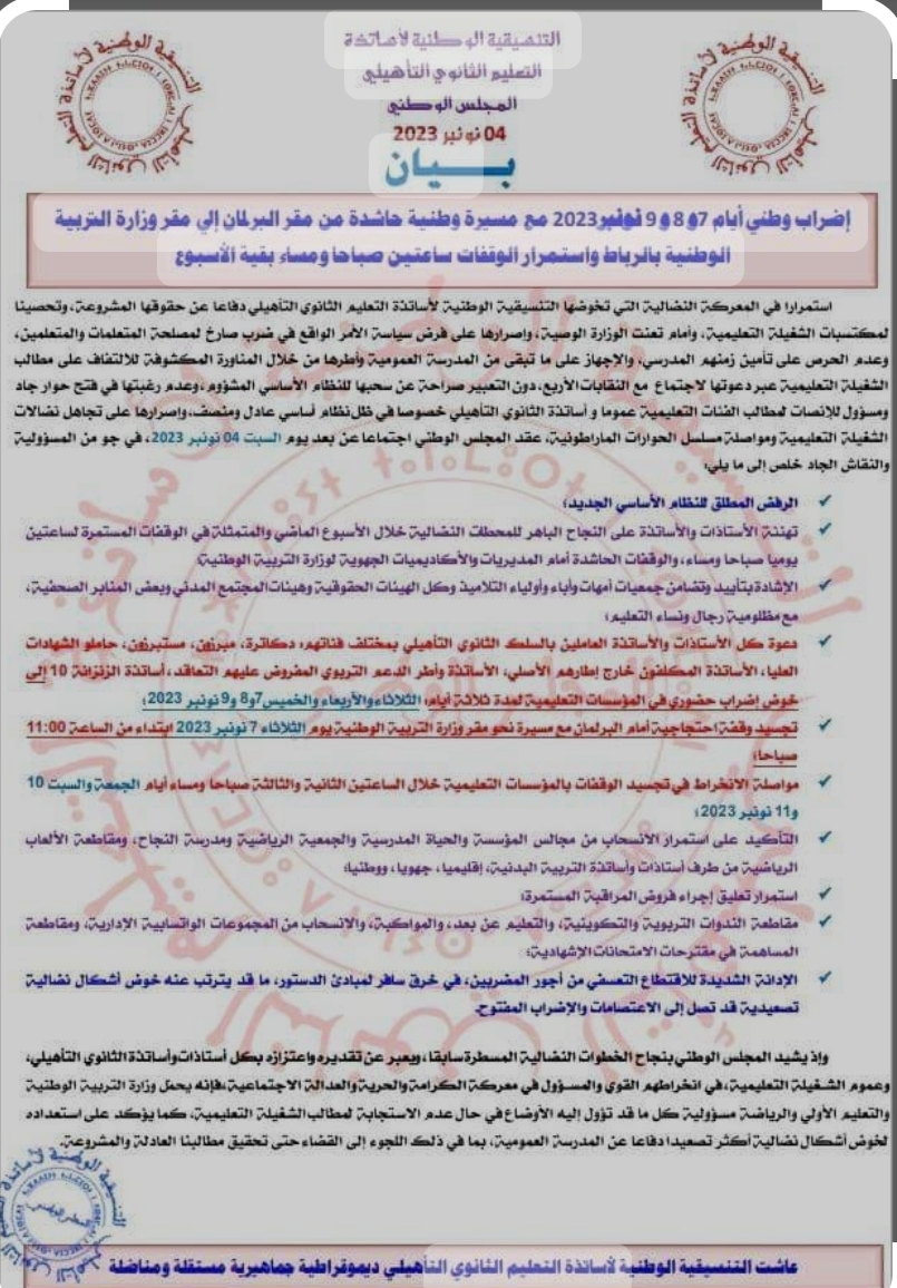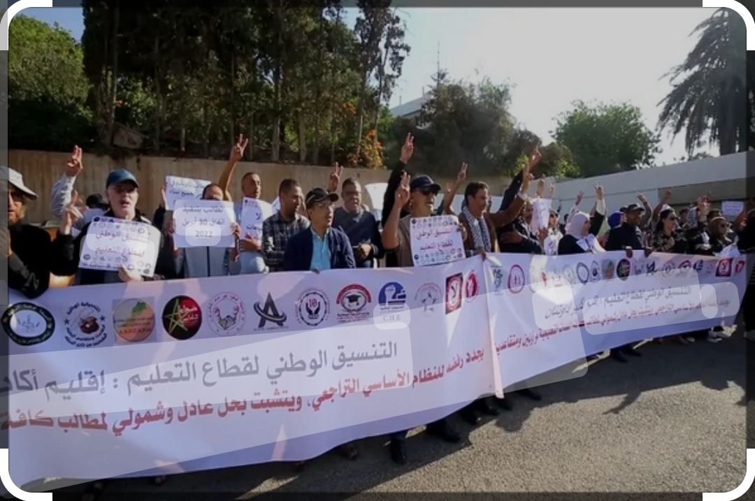 دعا التنسيق الوطني لقطاع التعليم إلى إنجاح الاضراب الوطني أيام 7 و8 و9 نونبر الجاري، ومسيرة الرباط يوم الثلاثاء، والتي ستنطلق من أمام مقر البرلمان نحو وزارة التربية بالرباط. وطالب التنسيق، عبر بيان، إسقاط النظام الأساسي التراجعي، تحقيق جميع مطالب نساء ورجال التعليم متقاعدين ومزاولين، وضمان الحق في الإضراب وتوقيف الاقتطاعات من أجور المضربين. وتدخل الإحتجاجات التي يخوضها نساء ورجال التعليم شهرها الثاني في مواجهة مرسوم النظام الأساسي الجديد الخاص بموظفي قطاع التربية الوطنية.