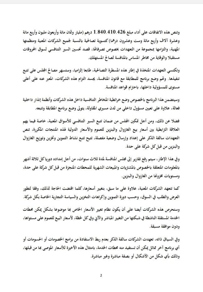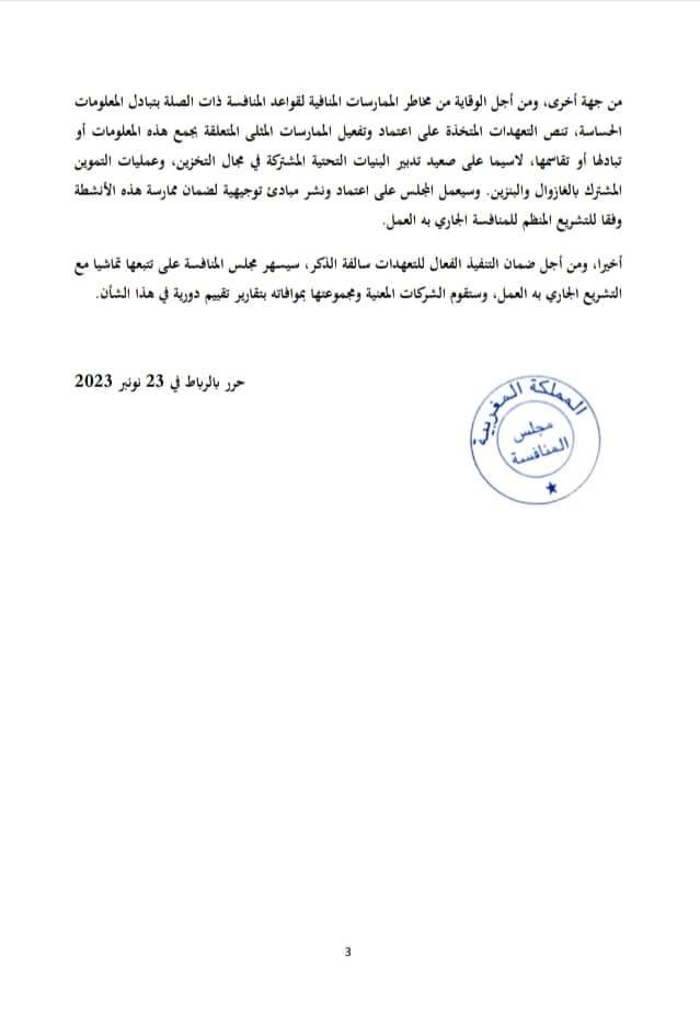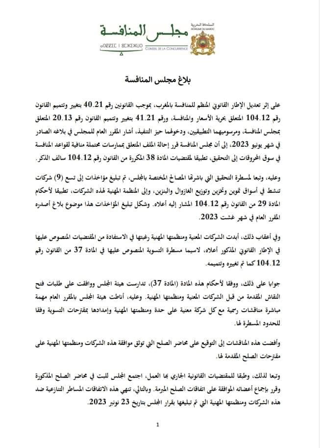 جاء في بلاغٍ لمجلس المنافسة ،أنه وتبعا لمسطرة التحقيق التي باشرتها المصالح المختصة بالمجلس، تم في غشت الماضي تبليغ مؤاخذات إلى تسع شركات تنشط في أسواق تموين وتخزين وتوزيع الغازوال والبنزين، وإلى المنظمة المهنية لهذه الشركات، تطبيقا لأحكام المادة 29 من القانون رقم 104.12. وأوضح المجلس أنه وفي أعقاب ذلك، أبدت الشركات المعنية ومنظمتها المهنية رغبتها في الاستفادة من المقتضيات المنصوص عليها في الإطار القانوني المذكور أعلاه، لاسيما مسطرة التسوية المنصوص عليها في المادة 37 من هذا القانون . وتبعا لذلك تدارست هيئة المجلس ووافقت على طلبات فتح النقاش المقدمة من قبل الشركات المعنية ومنظمتها المهنية. وعليه، أناطت هيئة المجلس بالمقرر العام مهمة مباشرة مناقشات رسمية مع كل شركة معنية على حدة ومنظمتها المهنية وإمدادها بمقترحات التسوية وفقا للحدود المسطرة لها. وأكد مجلس المنافسة أن المناقشات أفضت إلى التوقيع على محاضر الصلح التي توثق موافقة هذه الشركات ومنظمتها المهنية على مقترحات الصلح المقدمة لها. واجتمع المجلس للبت في محاضر الصلح المذكورة وقرر بإجماع أعضائه الموافقة على اتفاقات الصلح المبرمة. وبالتالي، تنهي هذه الاتفاقات المساطر التنازعية ضد هذه الشركات ومنظمتها المهنية التي تم تبليغها بقرار المجلس بتاريخ 23 نونبر .2023 وتنص هذه الاتفاقات على أداء مبلغ 1.840.410.426 درهم كتسوية تصالحية بالنسبة لجميع الشركات المعنية ومنظمتها المهنية، والتزامها بمجموعة من التعهدات بخصوص تصرفاتها، قصد تحسين السير التنافسي لسوق المحروقات مستقبلا والوقاية من مخاطر المساس بالمنافسة لصالح المستهلك. وأوضح المجلس أن التعهدات المتخذة في إطار هذه المسطرة التصالحية، تكتسي طابعا إلزاميا، وستسهر مصالح المجلس على تتبع تنفيذها. وتهم وضع برنامج للمطابقة مع قانون المنافسة، يجسد التزام هذه الشركات، المعبر عنه على أعلى مستوى للمسؤولية داخلها، باحترام قواعد المنافسة. وسيتضمن هذا البرنامج بالخصوص وضع خرائطية المخاطر التنافسية داخل هذه الشركات وأنظمة إنذار داخلية فعالة، علاوة على تعيين مسؤول داخلي من لدن مسيري المقاولة، يتولى وضع برنامج المطابقة وتتبعه. فضلا عن ذلك، ومن أجل تمكين المجلس من ضمان تتبع السير التنافسي للأسواق المعنية، خاصة فيما يهم العلاقة الترابطية بين أسعار بيع الغازوال والبنزين للعموم والأسعار الدولية لهذه المنتجات المكررة، تنص التعهدات سالفة الذكر على إعداد وإرسال وضعية مفصلة، تتيح تتبع نشاط التموين وتخزين وتوزيع الغازوال والبنزين من قبل كل شركة على حدة. وفي هذا الإطار، سيتم رفع تقارير إلى مجلس المنافسة لمدة ثلاث سنوات، من أجل إمداده دوري كل ثلاثة أشهر بالمعلومات المتعلقة بالخصوص بالمشتريات والمبيعات الشهرية للمحطات المنجزة من قبل كل شركة على حدة، ومستويات مخزونها من الغازوال والبنزين. كما تتعهد الشركات المعنية، بتغيير أسعارها، كلما اقتضت الحاجة لذلك، وفقا لتطور العرض والطلب في السوق، وحسب دورة التموين وإكراهات التخزين والسياسة التجارية الخاصة بكل شركة. وستحرص هذه الشركات أيضا على أن يكون نظام تغيير الأسعار الخاص بها موضوعا بشكل يمكن محطات الخدمة المستقلة الناشطة في شبكتها من التغيير المباشر والآني وفي كل لحظة، لأسعار البيع للعموم على مستواها، ودون موافقة مسبقة. وفي السياق ذاته، تعهدت الشركات سالفة الذكر بعدم ربط الاستفادة من برامج الخصومات أو الحسومات أو أي برنامج آخر مماثل يمكن أن تستفيد منه محطات الخدمة، بامتثال هذه الأخيرة للأسعار الموصى بها من قبلها، وذلك بأي شكل من الأشكال أو بصفة مباشرة وغير مباشرة. ومن أجل الوقاية من مخاطر الممارسات المنافية لقواعد المنافسة ذات الصلة بتبادل المعلومات الحساسة، تنص التعهدات المتخذة بحسب بلاغ المجلس على اعتماد وتفعيل الممارسات المثلى المتعلقة بجمع هذه المعلومات أو تبادلها أو تقاسمها، لاسيما على صعيد تدبير البنيات التحتية 
