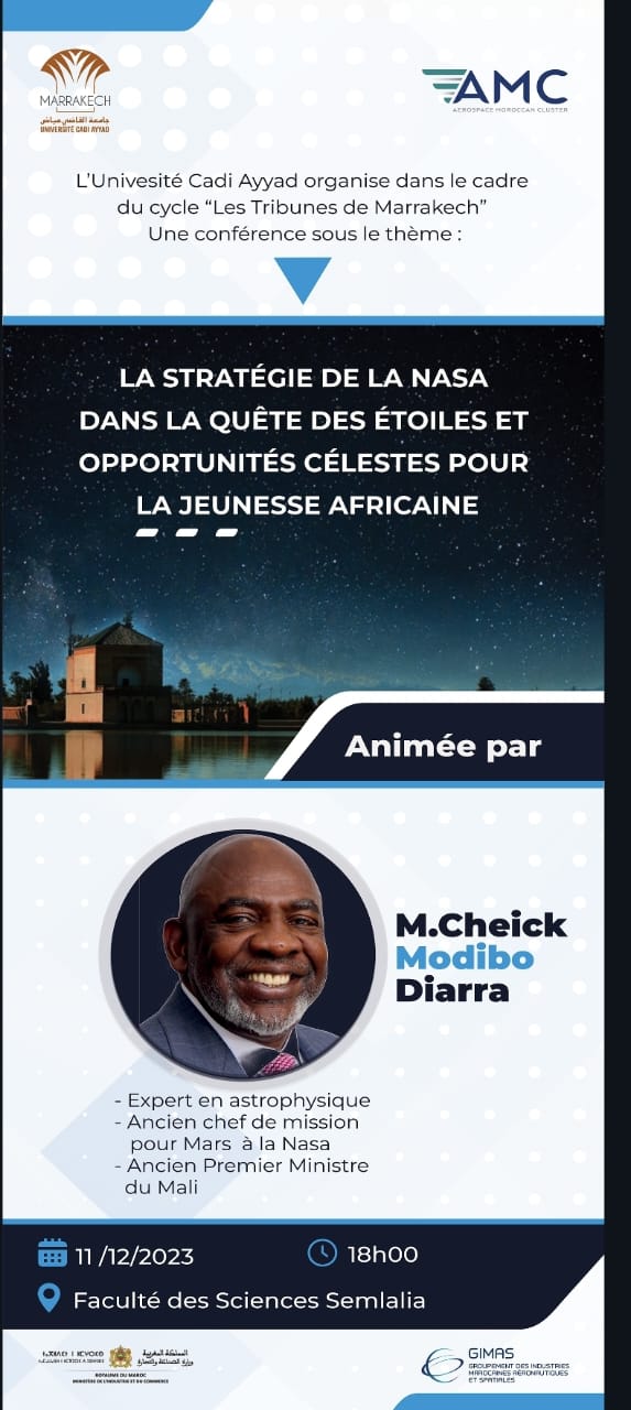 في إطار سلسلة محاضرات “منابر مراكش”، تستضيف جامعة القاضي عياض السيد شيخ موديبو ديارا، عالم الفيزياء الفلكية ورئيس وزراء مالي السابق ورئيس سابق مايكروسوفت أفريقيا، تحت شعار: “استراتيجية ناسا في البحث عن النجوم والفرص السماوية للشباب الأفريقي”. وذلك يوم الاثنين 11 ديسمبر 2023 الساعة السادسة مساءا بكلية العلوم السملالية بمراكش.