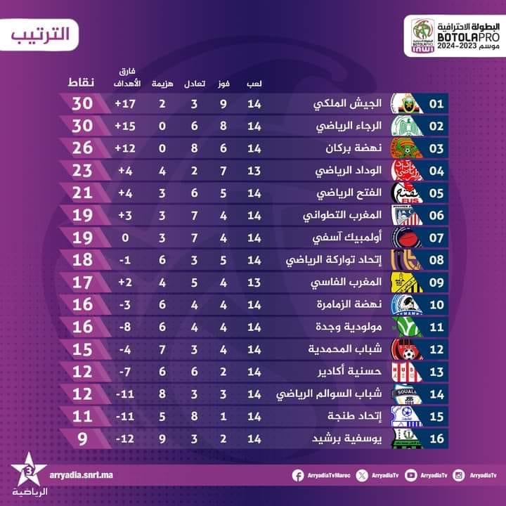 تفوق فريق الجيش الملكي على ضيفه المغرب التطواني بـ3-0 في المباراة التي جمعتهما مساء اليوم الخميس، بالملعب البلدي في مدينة القنيطرة، برسم الدورة 14 من البطولة الوطنية الاحترافية لكرة القدم. وافتتح فريق الجيش الملكي التسجيل عبر مهاجمه حمزة ايكمان في الدقيقة 38، وضاعف النتيجة الأمين زحزوح عند الدقيقة 52، ثم سجل الهدف الثالث عبد الفتاح حدراف في الدقيقة 87. وبعد هذه النتيجة، عاد فريق الجيش الملكي ليشارك الرجاء الرياضي الصدارة برصيد 30 نقطة، فيما بقي المغرب التطواني في المركز السادس برصيد 19 نقطة، رفقة أولمبيك آسفي.