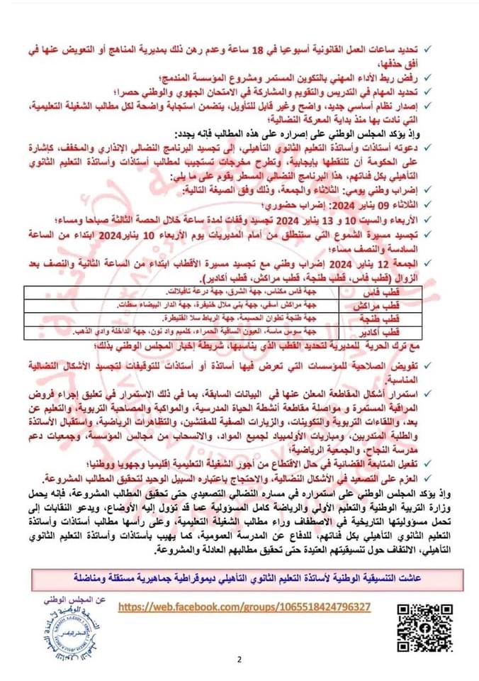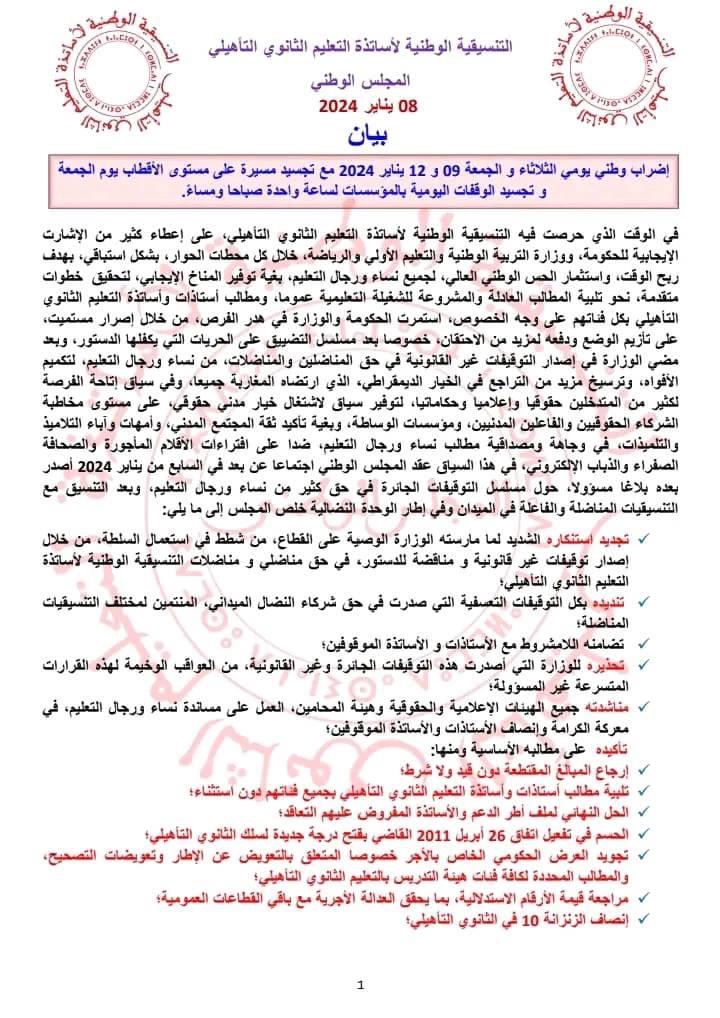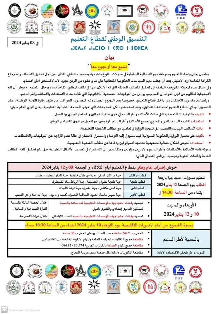 قرر التنسيق الوطني لقطاع التعليم، خوض إضراب عام وطني بقطاع التعليم أيام الثلاثاء والجمعة 09 و 12 يناير 2024، وذلك احتجاجا على ما وصفها بالتوقيفات التعسفية اللاقانونية التي طالت مئات الأستاذات والأساتذة وأطر الدعم. وعبر التنسيق الوطني في بيان أصدره مساء الاثنين عن تنديده بالتوقيفات التعسفية التي طالت الأساتذة وأطر الدعم في خرق سافر للقوانين والمساطر الجاري بها العمل، معلنا استعداده لتقديم الدعم المادي والمعنوي لجميع الأساتذة وأطر الدعم الموقوفين عبر تفعيل صندوق التضامن الوطني. وسجل التنسيق الوطني لقطاع التعليم، أن منسوب الاحتقان من داخل قطاع التعليم، يتصاعد خصوصا بعد الهجوم الجبان وغير المحسوب العواقب من طرف وزارة التربية الوطنية، مؤكدا أن رجال ونساء التعليم، يواصلون رسم ملاحمهم النضالية البطولية في سجلات التاريخ بتضحية وصمود منقطعي النظير، من أجل تحقيق الانصاف واسترجاع الكرامة المداسة ورد الاعتبار. وعبر المصدر ذاته، عن إدانته لأساليب التهديد والترهيب التي تنهجها الوزارة في تعاملها مع مطالب الشغيلة التعليمية، محملا الوزارة والحكومة المسؤولية فيما ستؤول إليه الأوضاع واستمرار الاحتقان في حالة عدم التراجع عن التوقيفات والاقتطاعات. وأكد التنسيق الوطني استعداده لخوض أشكال نضالية تصعيدية تحصينا للموقوفين ودفاعا عن مطالب الشغيلة التعليمية، داعيا كافة الأساتذة والأستاذات وأطر الدعم والإداريين مزاولين ومتقاعدين إلى الاستمرار في تجسيد الأشكال النضالية حتى يتم تحقيق كافة المطالب. وبناء على ذلك، أعلن التنسيق الوطني لقطاع التعليم، عن تنظيم مسيرات احتجاجية بأربعة أقطاب يوم الجمعة 12 يناير 2024، ويتعلق الأمر بكل من قطب مراكش، وقطب طنجة، وقطب فاس، وقطب أكادير، مع تجسيد وقفات احتجاجية بالمؤسسات التعليمية يوم الأربعاء والسبت 10 و 13 يناير الجاري لمدة ساعة بالنسبة، للسلكين الثانوي إعدادي والثانوي تأهيلي خلال الحصة الثالثة بالنسبة للفترة الصباحية والمسائية كما قرر المصدر ذاته، تجسيد وقفات احتجاجية بالمؤسسات التعليمية بالنسبة للسلك الابتدائي خلال فترات الاستراحة مسيرة الشموع من أمام المديريات الإقليمية يوم الأربعاء 10 يناير 2024 ابتداء من الساعة 18:30 مساء وبالنسبة لأطر الدعم، دعا التنسيق الوطني إلى العمل ب 24/21 ساعة حسب السلك ورفض العمل بـ 38 ساعة، مع مقاطعة جميع التكاليف بالحراسة العامة والمهام الإدارية الخارجة عن الاختصاص مقاطعة جميع المهام المضافة بالقرارات الوزارية 714. 20 / 064.22.ودعا التنسيق الوطني للتعليم الممونين وأطر ملحقي الاقتصاد والإدارة، مقاطعة التكوينات وأمانة مال جمعية دعم مدرسة النجاح. في مقابل ذلك، رفض وزير التربية الوطينة استمرار إضرابات الأساتذة التي تجاوزت 11 أسبوعا متواصلا، وأكد أن الإضراب حق دستوري وفي نفس الوقت، يلزم تأمين السير العادي للدراسة بالمؤسسات التعليمية، مضيفا وهو ما دفع الوزارة إلى اتخاذ حزمة من الإجراءات، التي تواجه كل من يعرقل المرفق التربوي العمومي ويسم بالحق الدستوري للتلاميذ في الدراسة. وفي هذا الصدد، نبه المسؤول الحكومي، خلال مثوله أمام البرلمان إلى أنه تم على صعيد عدد من المؤسسات، تسجيل العنف اللفظي والمضايقات والاعتداءات في حق مجموعة من الأساتذة الذين يرفضون الإضراب، إضافة إلى أعمال للتحريض داخل المؤسسات التعليمية وعدم احترام حرمة المدارس. وأكد بنموسى أن هذه الممارسات التي تفسر الإجراءات التي اتخذتها الوزارة في حق الأطر، وزاد: خرجنا من موضوع الإضراب ودخلنا إلى أمور أخرى ولهذا نعتبر بأن حق التلاميذ في المدرسة، هو أيضا حق دستوري وهو ما يتطلب تعبئة كل الأطراف المعنية لضمان استفادة التلاميذ مما تبقى من الزمن الدراسي، لاسيما أن الأمر يتعلق بحوالي 7 ملايين تلميذ و5 ملايين أسرة.
