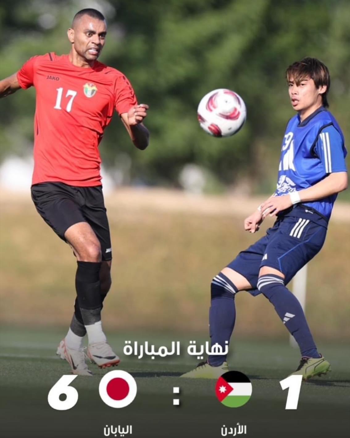 مني منتخب الأردن لكرة القدم بهزيمة قاسية أمام منتخب اليابان بنتيجة 6-1 في مباراة ودية أقيمت بينهما اليوم الثلاثاء في العاصمة القطرية الدوحة، في ختام استعداداته لمنافسات كأس آسيا لكرة القدم. وسجل أهداف اليابان كل من كو إيتاكورا (14)، تاكاتو ناكامورا (18)، هدف عكسي (32)، تاكومي مينامينو (43)، تاكوما أسانو (71)، دايزين مايدا (79). فيما سجل هدف الأردن الوحيد صالح راتب (87). وتأتي هذه الهزيمة بعد أيام قليلة من فوز الأردن على منتخب أفغانستان بنتيجة 2-1 في مباراة ودية أخرى. ويلعب منتخب الأردن في المجموعة الخامسة بكأس آسيا مع ماليزيا وكوريا الجنوبية والبحرين، بينما يقع المنتخب الياباني في المجموعة الرابعة مع فيتنام والعراق وإندونيسيا.