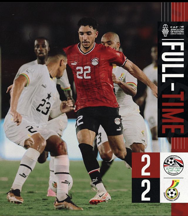 تعادل الفراعنة أبطال إفريقيا 7 مرات أمام غانا 2-2 الخميس على ملعب فيليكس أوفويت- بوانيي في أبيدجان، في مباراة شهدت خسارة جهود قائدها ونجمها الأبرز محمد صلاح للإصابة، في منافسات المجموعة الثانية لكأس أمم إفريقيا لكرة القدم في ساحل العاج. وسجّل محمد قدوس هدفي غانا (45+3 و71)، وعمر مرموش (69) ومصطفى محمد (74) لمصر. وبهذا التعادل، رفعت مصر رصيدها إلى نقطتين أمام غانا (نقطة)، بانتظار نتيجة مباراة الرأس الأخضر (ثلاث نقاط) أمام موزامبيق (نقطة) اللذين يتواجهان الجمعة.