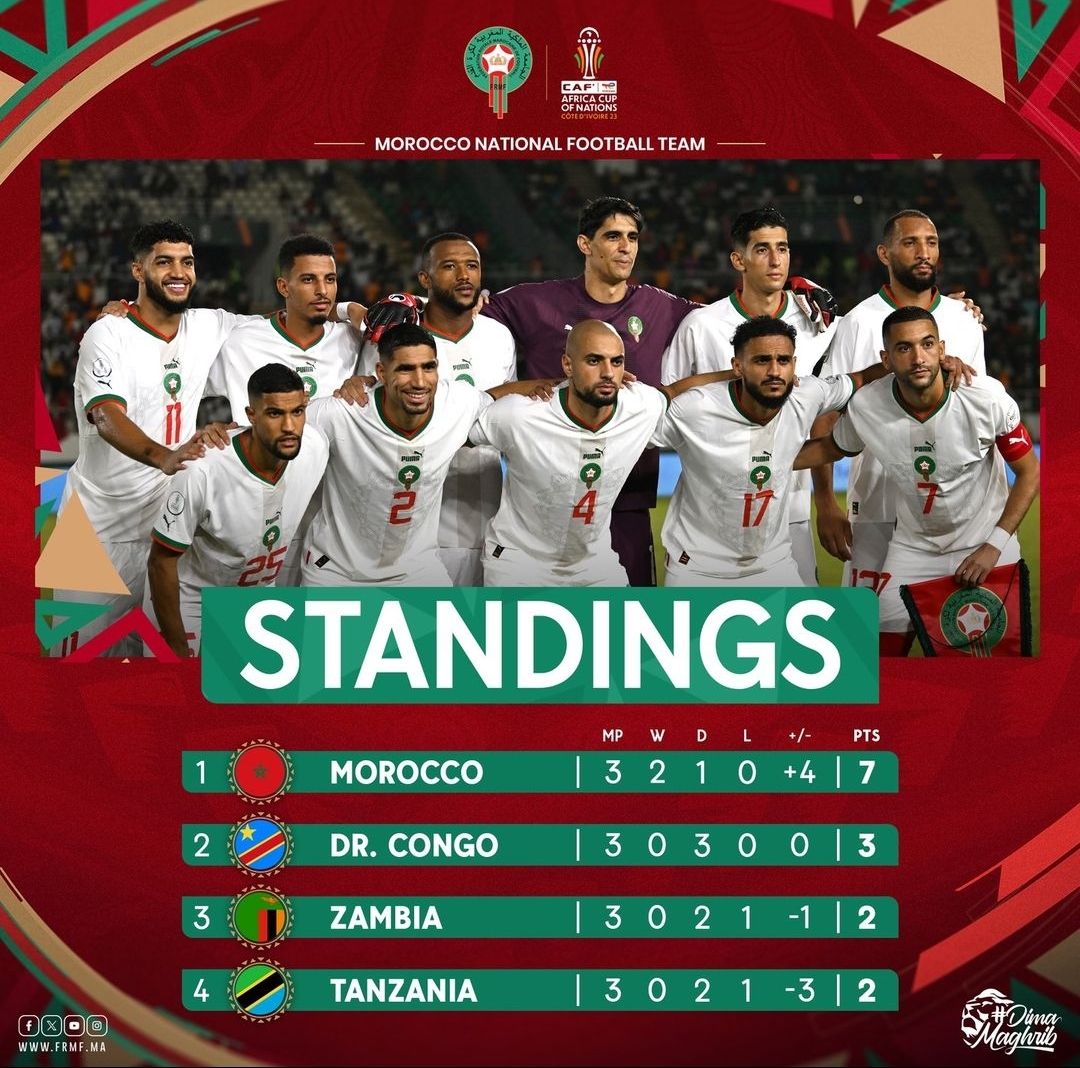تأهل المنتخب الوطني المغربي رابع مونديال 2022 لثمن نهائي كأس أمم إفريقيا لكرة القدم في صدارة المجموعة السادسة بفوزه على زامبيا 1-0، على ملعب لوران بوكو في سان بيدرو، فيما رافقته الكونغو التي تعادلت مع تنزانيا سلبيا.وتصدّر الاسود ، الباحثة عن لقبها الثاني بعد 1976، مجموعتها بسبع نقاط متقدمة بفارق أربعة نقاط عن الكونغو التي حلّت ثانية، فيما جاءت زامبيا في المركز الثاني بنقطتين، ما سمح للمضيفة ساحل العاج بالتأهل من ضمن أفضل أربعة منتخبات حلّت في المركز الثالث، فيما حلّت تنزانيا في المركز الأخير بنقطة واحدة. وخاض الفريق الوطني اللقاء دون مدربه وليد الركراكي الذي أوقفه الاتحاد الإفريقي للعبة الأربعاء أربع مباريات، اثنتان منها مع وقف التنفيذ، لأسباب انضباطية على خلفية الاحداث التي شهدتها نهاية مباراة منتخب المغرب ضد نظيره الكونغولي وصدامه مع مدافعها وقائدها شانسيل مبيمبا. وقال لاعب الوسط سفيان أمرابط في تصريحه لإحدى القنوات التلفزيونية "في هذه البطولة كل المباريات صعبة. فزنا بالمباراة وحققنا صدارة المجموعة". وتابع "لكن بالنسبة لنا البطولة تبدأ الآن ونعد الجمهور بالعودة بالبطولة".،وقد أجرى الركراكي ومساعده رشيد بن محمود أربعة تغييرات على تشكيلته الأساسية التي تعادلت أمام الكونغو 1-1 في الجولة الماضية، فأشرك المدافع يونس عبد الحميد (36 عاما) والظهير العائد من الإصابة يحيى عطية الله والشاب إسماعيل صيباري والمهاجم أيوب الكعبي بدلا من يوسف النصير غير الموفق. بدأ الفريق الوطني اللقاء بضغط وهجمات متتالية بغية حسم اللقاء من الدقائق الاولى، لكنّ بدا واضحا عدم انسجام اللاعبين. ومرر زياش لأشرف حكيمي الذي سدّد من الخارج مرّت بجوار القائم (8)، فرد باتسون داكا بتسديدة من داخل المنطقة لكنّ كرته مرت قريبة ايضًا (10). د،و فرض المغاربة سيطرتهم الفنية، لكنّ ترجمة ذلك لهدف تأخر لأواخر الشوط الأول. وبعد كرة طويلة من نصف الملعب، أرسل الظهير أشرف حكيمي عرضية قوية من لمسة واحدة حاول الحارس الإمساك بها قبل الكعبي فسقطت أرضا أمام المنطلق زياش الذي سدد بقوة في الشباك (37). وبعد عرضية من بوفال سدد الكعبي رأسية قوية أخرجها الحارس لاورنس مولينغا ببراعة بأطراف أصابعه لركنية (40). وبين الشوطين شارك مهاجم باير ليفركوزن أمين عدلي بدلا من زياش الذي خرج بعد تعرضه لإصابة في نهاية الشوط الأول. ونال لاعبو زامبيا كثير من الثقة فسددوا عدة مرات على مرمى بونو، أخطرهم تسديدة لاميك باندا بيمناه من خارج الصندوق حادت عن القائم الأيمن (59) وأخرى ذهبت عالية من ميغيل تشايوا (61). استشعر الركراكي الخطر، فدفع بجناح ريال بيتيس الإسباني عبد الصمد الزلزولي وجناح رينس الفرنسي أمير ريتشاردسون (68). ثم دفع بمهاجم خنت البلجيكي طارق تيسودالي (73). وزادت زامبيا من حدة هجماتها في الدقائق الأخيرة بغية إحراز هدف التأهل المباشر. واخترق الزلزولي من الرواق الأيسر وتوغل داخل المنطقة لكنّ تسديدته ذهبت عالية فوق العارضة (90+3). وأطلق الحكم صافرة النهاية وسط احتفالات كبيرة من جمهور ساحل العاج حيث حسم البلد المضيف تأهله لثمن النهائي بفضل فوز المغرب على زامبيا. في المباراة الأخرى على ملعب لوران بوكو في سان بيدرو، تعادلت الكونغو مع تنزانيا سلبا .