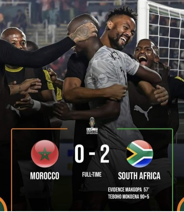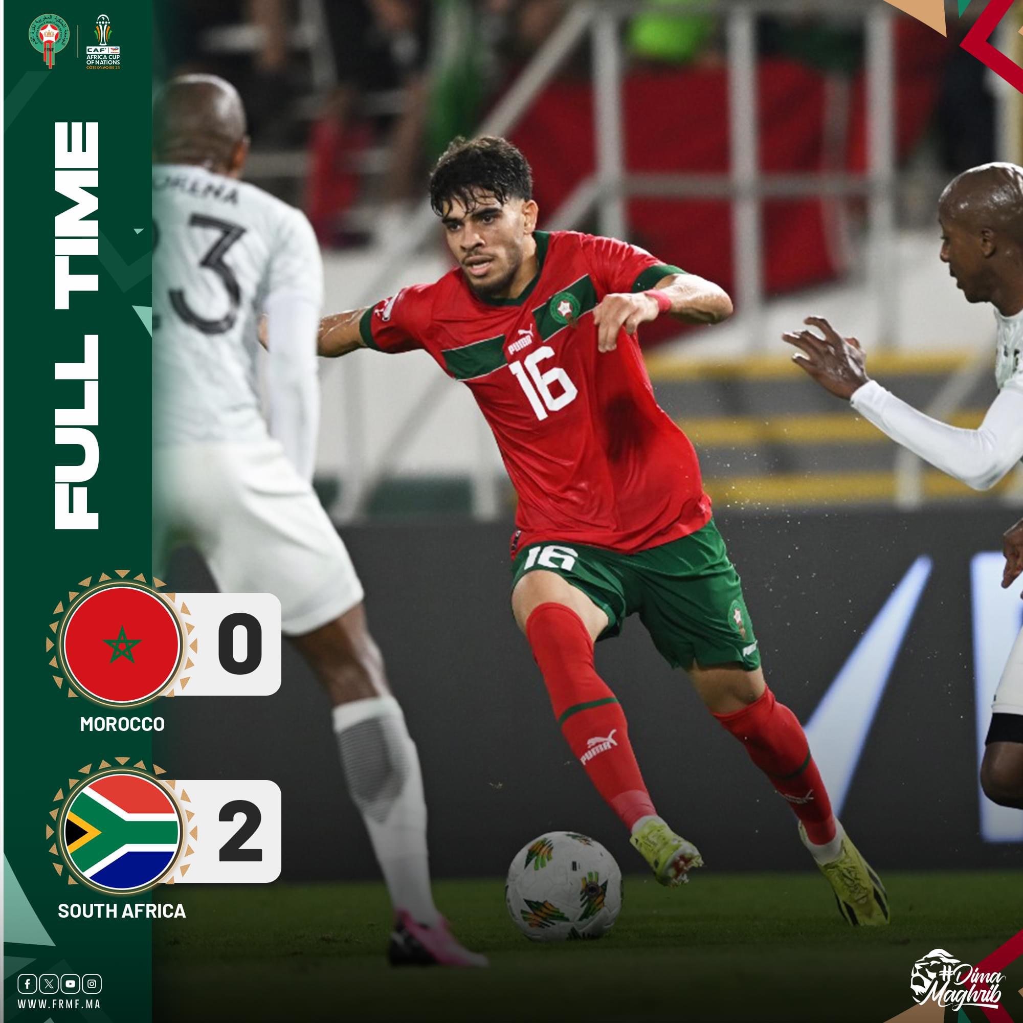 ودع المنتخب الوطني المغربي منافسات كأس أمم إفريقيا من الدور ثمن النهائي عقب هزيمته أمام المنتخب الجنوب إفريقي، بهدفين دون رد، في المباراة التي جمعت الطرفين على أرضية ملعب لورون بوكو بمدينة سان بيدرو. وبدأ أسود الأطلس المباراة بقوة حيث ضغطوا منذ البداية على المنافس الجنوب إفريقي غير أن هذا الأخير كان قريبا بعد ربع ساعة من افتتاح حصة التهديف بتسديدة قوية من خارج منطقة العمليات تصدى لها بنجاح الحرس، ياسين بونو. وأضاعت العناصر الوطنية سيلا من الفرص المحققة حيث افتقد اللاعبون للمسة الأخيرة، خاصة الفرصتين الخطيرتين من قبل أمين عدلي وسليم أملاح لتنتهي الجولة الأولى بالتعادل السلبي. وتواصل مسلسل تضييع الفرص من الجانب المغربي قبل أن ينجح منتخب البافانا بافانا، ضد مجرى اللعب، من التوقيع على هدف التقدم في حدود الدقيقة 57 من الجولة الثانية مستغلا سوء تموضع في الدفاعات المغربية. وترجم المنتخب المغربي ضغطه الهجومي بالحصول على ضربة جزاء في الدقيقة 83 غير أن النجم، أشرف حكيمي، لم يتمكن من ترجمتها لهدف حيث ارتطمت كرته في العارضة بينما أكمل الأسود اللقاء بعشرة لاعبين عقب طرد سفيان أمرابط. ووقع المنتخب الجنوب إفريقي على هدفه الثاني قبل دقائق على النهاية من ضربة حرة مباشرة، ليودع المنتخب الوطني المغربي منافسات كأس أمم إفريقيا من الدور ثمن النهائي. وسيواجه منتخب جنوب إفريقيا في الدور ربع النهائي منتخب الرأس الأخضر، وذلك مساء السبت المقبل، الذي نجح في الإطاحة بالمنتخب الموريتاني بهدف دون رد.