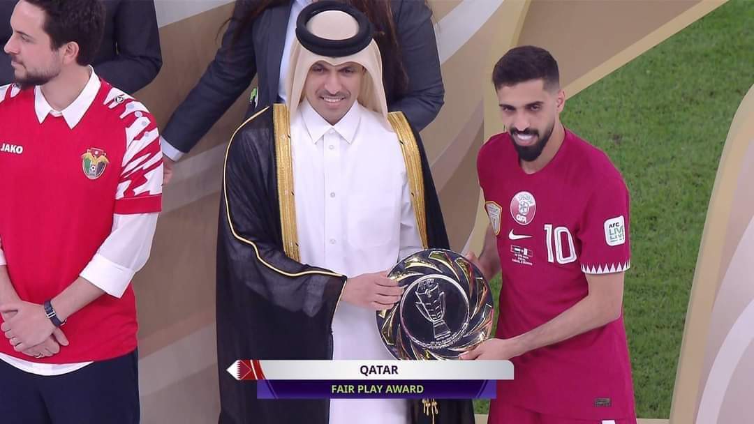 سيطر منتخب قطر على جوائز كأس الأمم الآسيوية لكرة القدم 2023، التي اختتمت اليوم على ملاعبه، حيث توج منتخب العنابي ببطولة كأس أمم آسيا 2023 وللمرة الثانية على التوالي، بالفوز على الأردن بنتيجة 3-1، فى المباراة التي جمعت المنتخبين مساء السبت على استاد لوسيل، فى المباراة النهائية على لقب بطولة كأس أمم آسيا 2023، ليحقق العنابي اللقب الثاني على التوالي بعد الفوز بلقب 2019،وتوج نجم المنتخب القطري أكرم عفيف بجائزتي أفضل لاعب في المسابقة وأفضل هداف برصيد 8 أهداف، فيما نال مشعل برشم، حارس مرمى قطر جائزة أفضل حارس في النسخة الحالية للبطولة. ونال منتخب قطر أيضًا جائزة اللعب النظيف في النسخة الـ18 لكأس الأمم الآسيوية. ورفع لاعبو منتخب قطر كأس أمم آسيا 2023 بعد أن توج العنابي باللقب للمرة الثانية على التوالي، بالفوز على الأردن بنتيجة 3-1، فى المباراة التي جمعت المنتخبين مساء السبت على استاد لوسيل، فى المباراة النهائية على لقب بطولة كأس أمم آسيا 2023، ليحقق العنابي اللقب الثاني على التوالي بعد الفوز بلقب 2019. وبعد اللقاء تسلم المخضرم حسن الهيدوس كأس البطولة من الشيخ تميم بن حمد أمير دولة قطر، بجانب جياني إنفانتينو رئيس الفيفا محتفلا مع لاعبي العنابي بطريقة الأسطورة الأرجنتيني ليونيل ميسي عندما تسلم لقب كأس العالم على نفس الملعب في مونديال 2022.