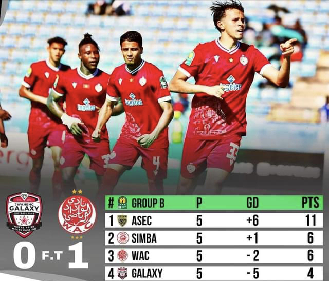 استطاع فريق الوداد الرياضي العودة بثلاث نقط غالية خارج الديار ،جعلته يحتفظ بحظوظه في بلوغ ربع نهائي مسابقة دوري أبطال إفريقيا بعد انتصاره بهدف دون رد، أمام جوانينج جالاكسي البوتسواني، في المباراة التي جمعت الطرفين على أرضية ملعب أوبيد إيتاني ستاديوم، لحساب الجولة الخامسة وما قبل الأخيرة. ولم تتح فرص سانحة للتسجيل للفريق الأحمر أمام نظيره البوتسواني في الشوط الأول، غير أن أبناء التونسي، فوزي البنزرتي، نجحوا في إنهائه بالتقدم بهدف دون رد من رأسية لبدر كدارين في الوقت الإضافي من الجولة الأولى. وبهذه النتيجة، رفع الوداد الرياضي رصيده للنقطة السادسة في المركز الثالث وهو الرصيد ذاته الذي يتوفر عليه سيمبا التنزاني صاحب الوصافة الذي يتفوق في المواجهات المباشرة، بينما يقبع جوانينغ غالاكسي في المركز الأخير برصيد 4 نقاط.