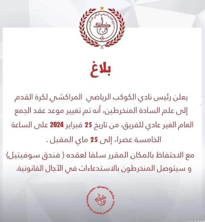 كان من المقرر حسب بلاغ سابق انعقاد الجمع الاستثنائي للكوكب يوم 10 يناير الماضي، و تم تأجيله إلى يوم 25 فبراير الجاري على الساعة الخامسة مساء بأحد الفنادق المصنفة بمراكش ،إلا أن الجمهور المراكشي تفاجأ مرة أخرى ببلاغ آخر يعلن عن تأجيله لثالث مرة إلى يوم 25 ماي، الشيء الذي حير الرأي العام الرياضي المراكشي حول التلاعب بمشاعرهم، و إن دل هذا على شيء فإنما يدل على أن رئيس الفريق حنيفة ينهج  سياسة التسيير العشوائي و الارتجالية في التدبير و الضحك على مناصري الكوكب، علما ان البلاغات الثلاثة الصادرة عن إدارة الفريق لم تشر إلى جدول أعمال الجمع الاستثنائي ليبقى الغموض و اللبس سيد الموقف، و هو الأمر الذي جعل الجميع يتساءل عن الجدوى من هذا القرار، هل من أجل استقالة الرئيس ؟، أم أن هناك أمور أخرى تدور في الكواليس لا يعلمها إلا الرئيس و أتباعه.