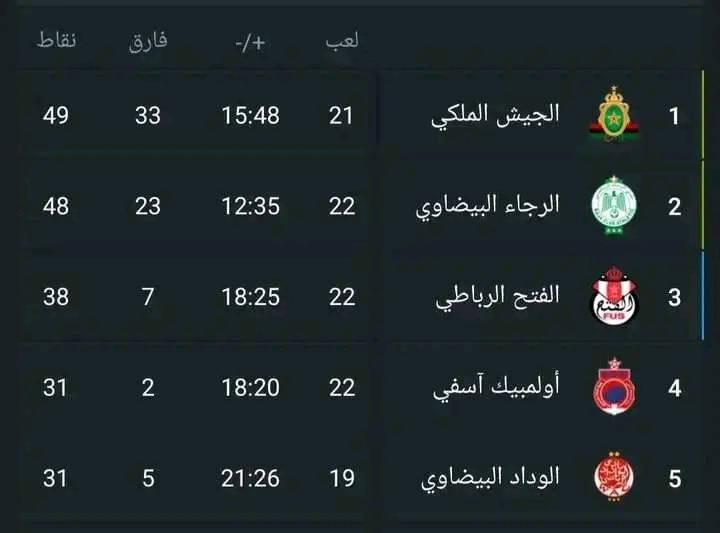 قلص فريق الرجاء الفارق عن الجيش إلى نقطة وحيدة برصيد 48 نقطة مع مباراة مؤجلة للعساكر ضد النهضة البركانية في حين تجمد رصيد أولمبيك آسفي عند النقطة 31 في المركز الخامس. و في ما يلي نتائج وبرنامج باقي مباريات الدور الـ 22 من البطولة الوطنية الاحترافية إنوي لكرة القدم للقسم الأول: الجمعة 1 مارس: شباب المحمدية الفتح الرياضي (0-1) اتحاد تواركة يوسفية برشيد (3-2) السبت 2 مارس: اتحاد طنجة الجيش الملكي (1-2) نهضة الزمامرة. حسنية أكادير (3-0) الأحد 3 مارس: الشباب السالمي المغرب التطواني (1-2) الرجاء الرياضي أولمبيك آسفي (1-0) المبارتان المؤجلتان: مولودية وجدة الوداد الرياضي نهضة بركان المغرب الفاسي