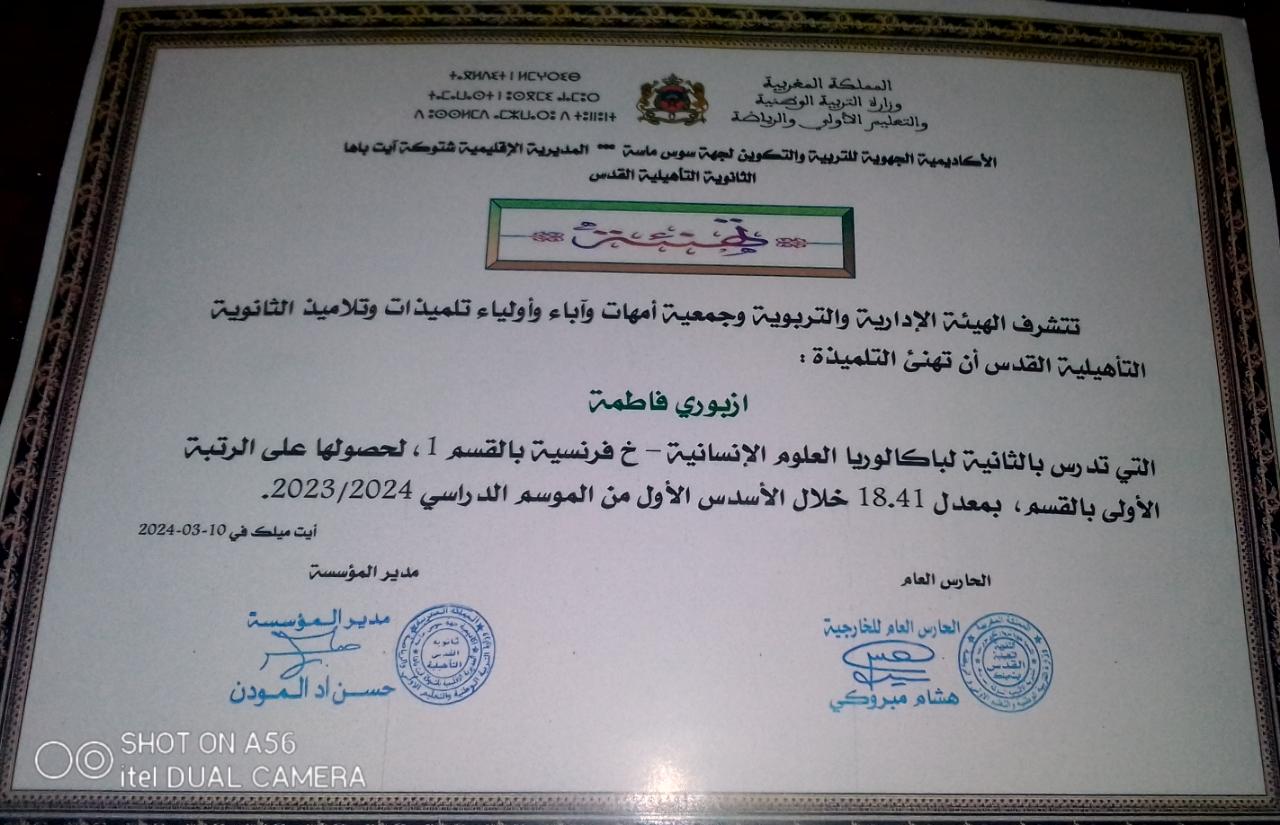 تتشرف الهيئة الإدارية والتربوية وجمعية أمهات وآباء وأولياء تلميذات وتلاميذ الثانوية التأهيلية القدس تهنئ التلميذة : ازبوري فاطمة، التي تدرس بالثانية لباكالوريا العلوم الإنسانية - خ فرنسية بالقسم 1 ، لحصولها على الرتبة الأولى بالقسم، بمعدل 18.41 خلال الأسدس الأول من الموسم الدراسي 2024/2023، وجاءت هذه التهنئة نتيجة تتبع للإنجازات الجيدة لتلاميذ وتلميذات هذه الثانوية ،الرائدة جهويا ووطنيا من حيث المردودية في العملية التعليمية التعلمية، فهنيئا للتلميذة ومزيداً من التفوق والنجاح ،وننوه بالمجهودات التي يقوم بها مدير المؤسسة السيد حسن اد المودن رفقة الحارس العام السيد هشام مبروكي ،وجميع موظفي الموسسة من الاساتذة لتحسين مردودية التلاميذ رغم ما عاشه هولاء من اضرابات اثرت على الجميع.
