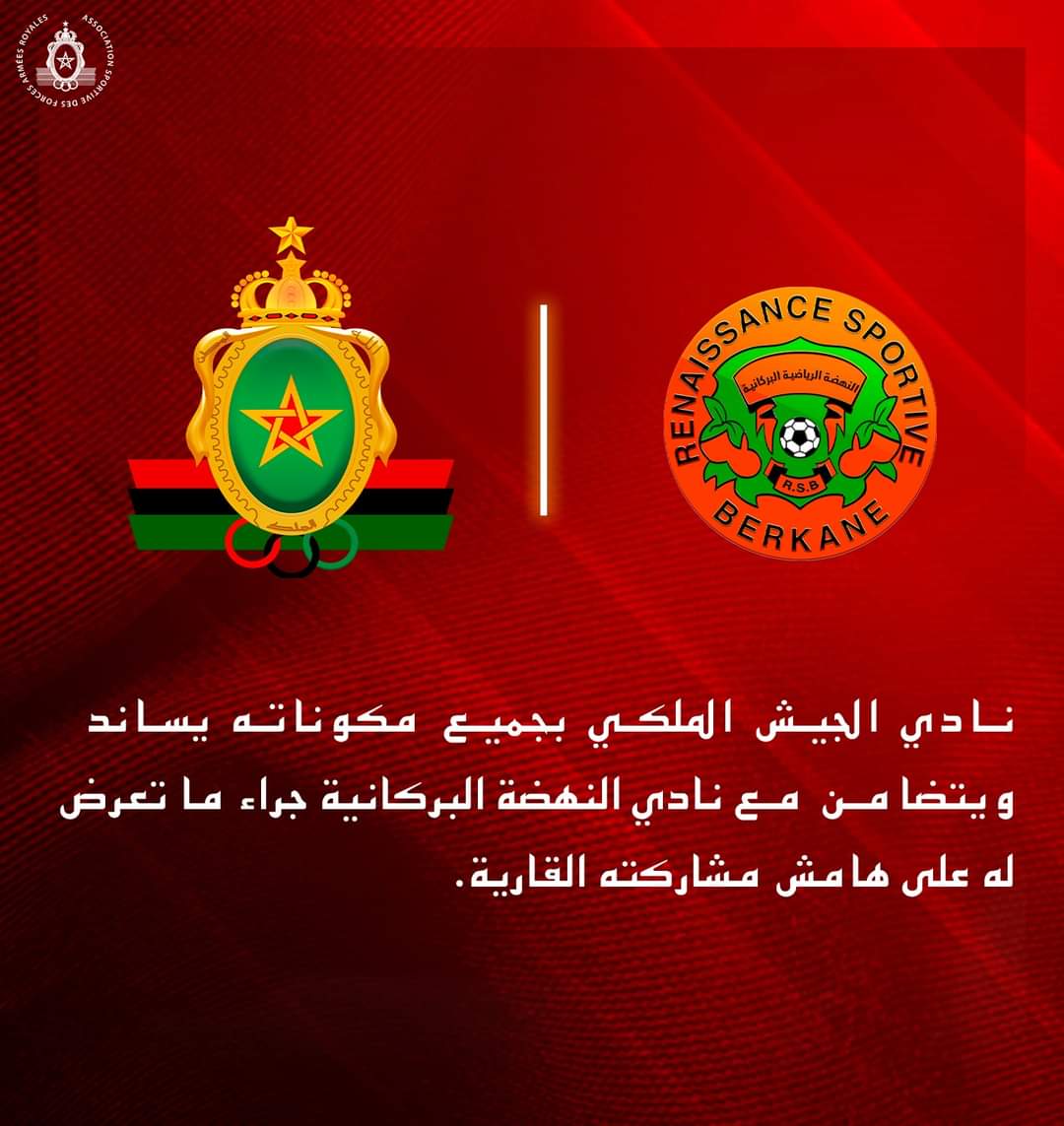 ، مساندتها لممثل المغرب في كأس الكاف، نهضة بركان ، في وجه الاستفزازات والأساليب غير الرياضية التي لجأ إليها المسؤولين الجزائريين من شرطة ودرك و الجمارك منذ حلول الوفد البركاني أمس بمطار هواري بومدين قبيل مقابلة نصف نهائي المنافسة، كما عبرت عن إستيائها الشديد من الأفعال التي قامت بها السلطات الجزائرية ، ضد فريق لكرة القدم يمثل بلده تحت غطاء الكاف ،فمنذ قدومه إلى هذا البلد الجار يا حسرة يوم أمس، لم يهدأ الاعلام المخزني في قيادة حملة اعلامية مغرضة و نشر المغالطات بعد ولوج مطار هواري بومدين ، حيث تم تزييف الحقيقة و تم الخروج عن النطاق الرياضي ، نتمنى ان تتحد الفرق الوطنية في حملة يكون شعارها ، الصحراء مغربية من طنجة إلى الكويرة و تكون الخريطة على جميع أقمصة الفرق الوطنية على غرار نهضة بركان.
