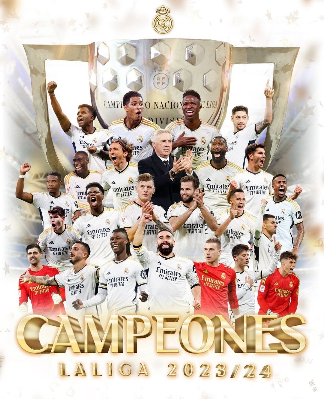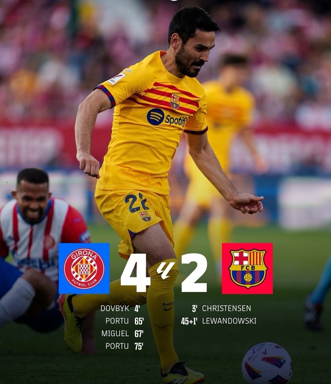 توج فريق ريال مدريد بطلا لمسابقة الدوري الإسباني للمرة الـ36 في تاريخه بشكل رسمي، بعد خسارة غريمه ومنافسه فريق برشلونة أمام مضيفه جيرونا بنتيجة 4-2، خلال المباراة التي جمعت الفريقين مساء السبت على ملعب استادي مونتيليفي، ضمن مباريات الجولة الـ34 لمنافسات الدوري الإسباني. تقدم أندريس كريستنسن للبارسا في الدقيقة 3 وتعادل سريعا أرتيم دوفبيك لأصحاب الأرض في الدقيقة 4، وقبل نهاية الشوط الأول تحصل برشلونة على ركلة جزاء، سجل منها النجم البولندي روبرت ليفاندوفسكي الهدف الثاني في الدقيقة 46.وفي الشوط الثاني، سجل جيرونا 3 في ربا شلشفش6ؤ أهداف متتالية في الدقائق 65 و67 و74 على الترتيب بهدفين للاعب بورتو، هدف لميجيل ,'ذجوتيريز،الخسارة منحت ريال مدريد التتويج بلقب الدوري الإسباني للمرة الـ36، حيث يحتل الصدارة برصيد 87 نقطة، فيما قفز جيرونا للوصافة برصيد 74 نقطة، بينما تراجع برشلونة للمركز الثالث برصيد 73 نقطة. ومع تبقي 4 جولات فقط على النهاية واتساع الفارق بين المتصدر والوصيف إلى 13 نقطة كاملة، يتوج ريال مدريد بطلا للدوري الاسباني بشكل رسمي، فحتى مع خسارة جميع مبارياته المقبلة وفوز الوصيف بجميع المباريات سيحصد الأخير 12 نقطة فقط.