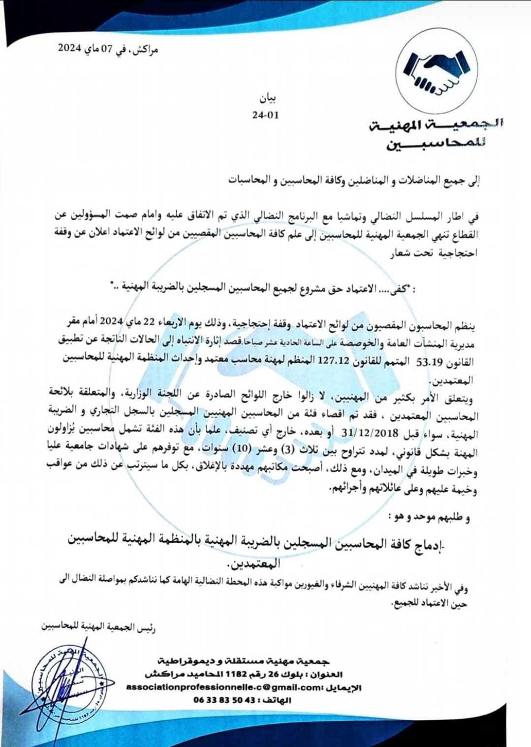 المعتمدين. ويتعلق الأمر بكثير من المهنيين لا زالوا خارج اللوائح الصادرة عن اللجنة الوزارية، والمتعلقة بلائحة المحاسبين المعتمدين ، فقد تم اقصاء فئة من المحاسبين المهنيين المسجلين بالسجل التجاري و الضريبة المهنية، سواء قبل 31/12/2018 أو بعده، خارج أي تصنيف، علما بأن هذه الفئة تشمل محاسبين يزاولون المهنة بشكل قانوني، لمدد تتراوح بين ثلاث (3) وعشر (10) سنوات، مع توفرهم على شهادات جامعية عليا وخبرات طويلة في الميدان، ومع ذلك، أصبحت مكاتبهم مهددة بالإغلاق، بكل ما سيترتب عن ذلك من عواقب وخيمة عليهم وعلى عائلاتهم وأجرائهم.