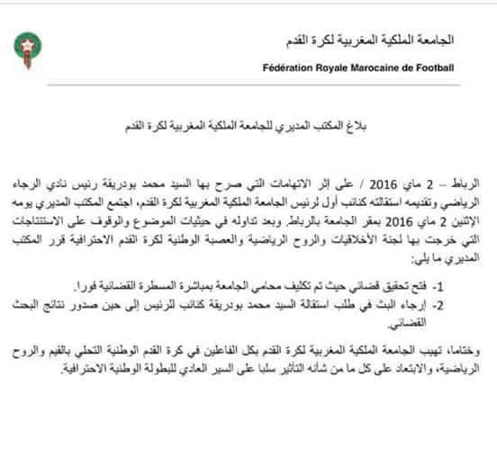 عقد المكتب الجامعي والعصبة الاحترافية إجتماع طارئ مساء اليوم من اجل تدارس التصريحات النارية والخطيرة التي أطلقها محمد بودريقة رئيس فريق الرجاء البيضاوي حينما شبه الدوري المغربي بسوريا وشكك ايضاً في مصداقية المكتب الجامعي والعصبة الاحترافية وليست هده المرة الاولى التي يطلقها فيها بودريقة تصريحات نارية لكن هده الزلة سيحاسب عليها من خارج اسوار الرياضة لانها عبارة مست خصوصية الدولة المغربية