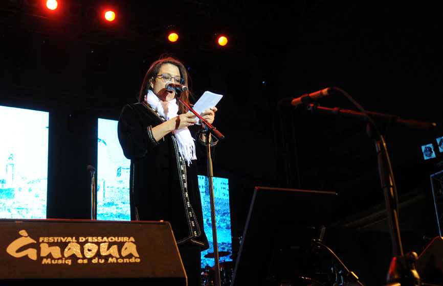 وتم افتتاح المهرجان بكلمة للسيدة نائلة التازي العبدي منتجة مهرجان كناوة وموسيقى العالم ، بحضور جمهور غفير لمحبي فن لكناوي، فوق المنصة لأول مرة بعد مرور 20 سنة من المهرجان.