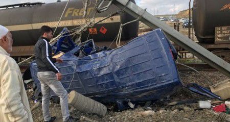 في جديد الفاجعة التي راح ضحيتها 6 عمال و أصيب 14 آخرون بطنجة، علمنا من مصادر مطلعة، أن المصالح الأمنية اعتقلت سائق العربة الذي يتلقى العلاجات الأولية بمستشفى محمد الخامس ، وكذا حارس المعبر السككي للاستماع إليهما في هذه الحادثة المميتة. و لقي ستة أشخاص مصرعهم وأصيب 14 آخرون صباح اليوم السبت في حادث اصطدام قطار لنقل البضائع يربط بين مدينة طنجة والميناء المتوسطي وسيارة لنقل المستخدمين، وذلك على مستوى ممر محروس بالقرب من مقاطعة بني مكادة.وأضاف المصدر ذاته أنه تم نقل الجرحى إلى مستشفى مدينة طنجة لتلقي العلاجات الضرورية. وأفادت السلطات المحلية بطنجة، أن حادث التصادم بين قطار لنقل البضائع وحافلة لنقل المستخدمين، أسفر عن مقتل 6 أشخاص واصابة 14 آخرين.وأوضحت السلطات المحلية، أن حادث التصادم بين قطار لنقل البضائع يربط بين مدينة طنجة والميناء المتوسطي وسيارة لنقل المستخدمين، قد وقع على مستوى ممر محروس بالقرب من مقاطعة بني مكادة. وأضاف المصدر ذاته أنه تم نقل الجرحى إلى مستشفى مدينة طنجة لتلقي العلاجات الضرورية.وأشار إلى أن مصالح الأمن فتحت تحقيقا لتحديد ملابسات الحادث تحت إشراف النيابة العامة المختصة،و من جهته قال المكتب الوطني للسكك الحديدية، إن "القطار الذي يحمل الرقم 3250توقف بشكل استثنائي عندما اعترضت طريقه حافة صغيرة على مستوى النقطة 12001 بين الدالية وملوسة". وأشار إلى أن الحادث تسبب في ضحايا تم نقلهم إلى مستشفى محمد الخامس دون تفاصيل
