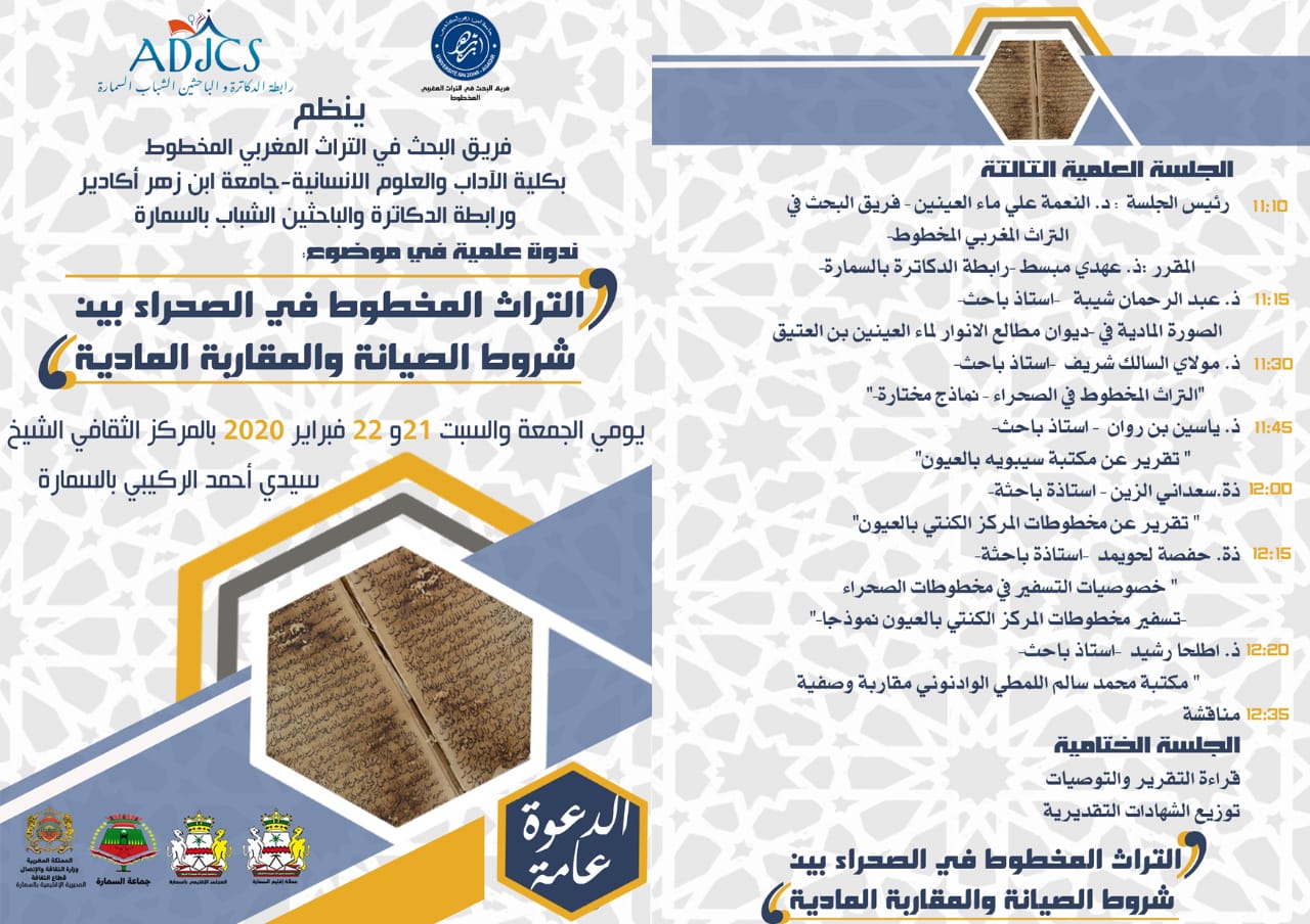 تماشيا و برنامجه السنوي ينظم فريق البحث في التراث المغربي المخطوط بكلية الأداب والعلوم الإنسانية بجامعة إبن زهر بأكادير ، بشراكة مع رابطة الدكاترة والباحثين الشباب بالسمارة ندوة علمية في موضوع "التراث المخطوط في الصحراء بين شروط الصيانة والعقارية المادية" و ذلك يومي الجمعة والسبت 21 و 22 فبراير الجاري بالمركز الثقافي الشيخ سيد احمد الركيبي .